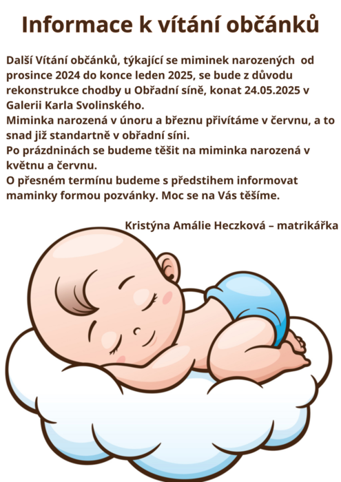 Další Vítání občánků, týkající se miminek narozených od prosince 2024 do konce leden 2025, se bude z důvodu rekonstrukce chodby u Obřadní síně, konat 24.05.2025 v Galerii Karla Svolinského.