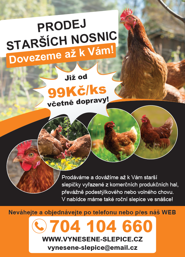 chtěli bychom Vás poprosit o informování chovatelů ve Vaší obci o možnosti objednat si kvalitní starší slepice s dovozem „až do kurníku“. Naši službu velmi vítají především starší občané, pro které je obtížné pro slepice někam jezdit a čekat ve frontách, ale i řada dalších chovatelů, kterým náš servis šetří čas i starosti se sháněním slepic.