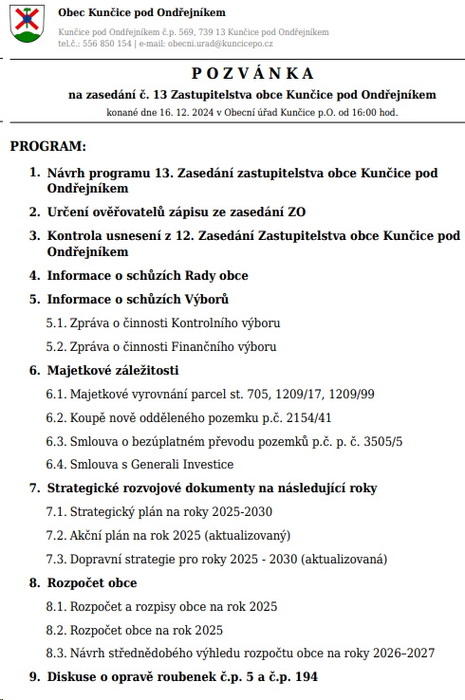 konané dne 16. 12. 2024 v Obecní úřad Kunčice p.O. od 16:00 hod.