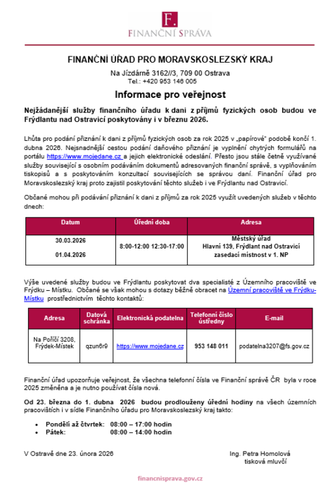 S ohledem na blížící se termín podání „papírového“ přiznání k dani z příjmů fyzických osob Vám zasíláme leták k výjezdům, které budou Finančním úřadem pro Moravskoslezský kraj organizovány ve spolupráci s naší obcí.