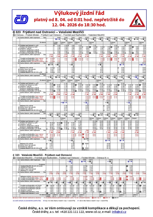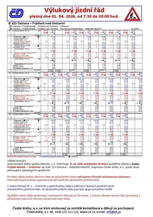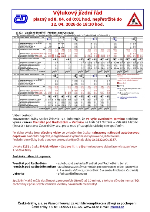 provozovatel dráhy Správa železnic, s.o. informuje o těchto výlukách: 1. 4. 2026 7:30 - 20:00 hod. proběhne výluka v úseku Frýdek-Místek - Vratimov.