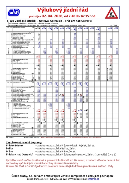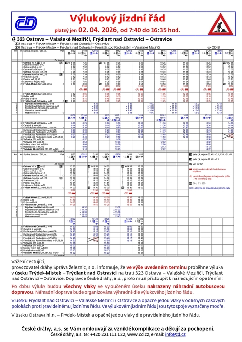 2. 4. 2026 7:40 - 16:35 hod. proběhne výluka v úseku Frýdek-Místek - Frýdlant nad Ostravicí